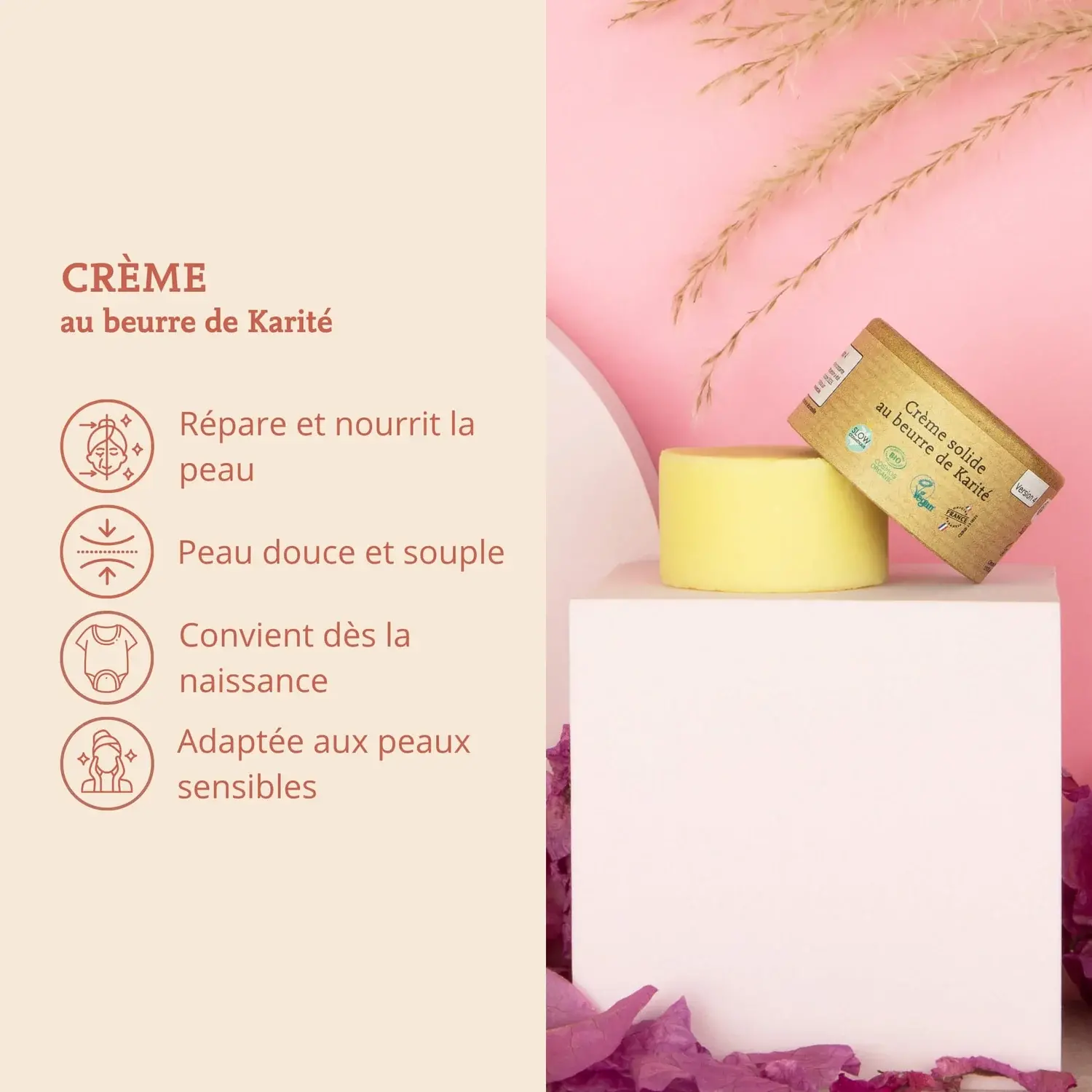 Composition courte : beurre de karité, huile d'olive, cire de candelilla, amidon de maïs